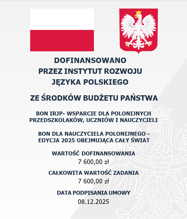 Informujemy, że w ramach programu „Bon dla nauczyciela polonijnego – edycja 2025”, realizowanego przy wsparciu Instytutu Rozwoju Języka Polskiego im. św. Maksymiliana Marii Kolbego, 8 nauczycieli polonijnych otrzymało wsparcie finansowe w łącznej wysokości 1790 EUR. Środki zostały przeznaczone na działania związane z rozwojem zawodowym nauczycieli, w tym na zakup publikacji i materiałów dydaktycznych, materiałów multimedialnych i licencji edukacyjnych, udział w kursach i szkoleniach podnoszących kwalifikacje oraz na pomoce dydaktyczne wykorzystywane w pracy dydaktycznej. Wyrażamy podziękowanie Instytutowi Rozwoju Języka Polskiego im. św. Maksymiliana Marii Kolbego za udzielone wsparcie i współpracę.